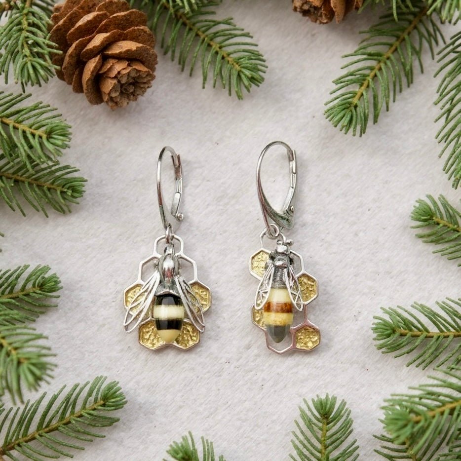 Sterling Silver Amber Bee and Honeycomb Lever-Back Earrings